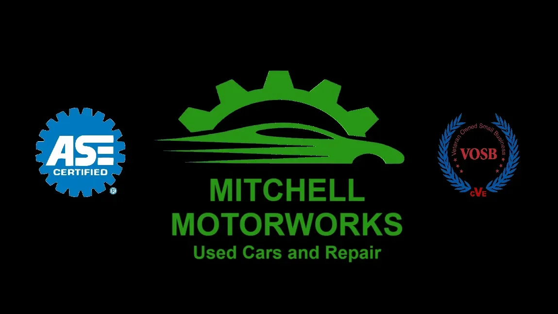 Logo for Mitchell Motorworks with a green car silhouette and gear design, includes text 'Mitchell Motorworks Used Cars and Repair', and has ASE Certified and VOSB certification badges.